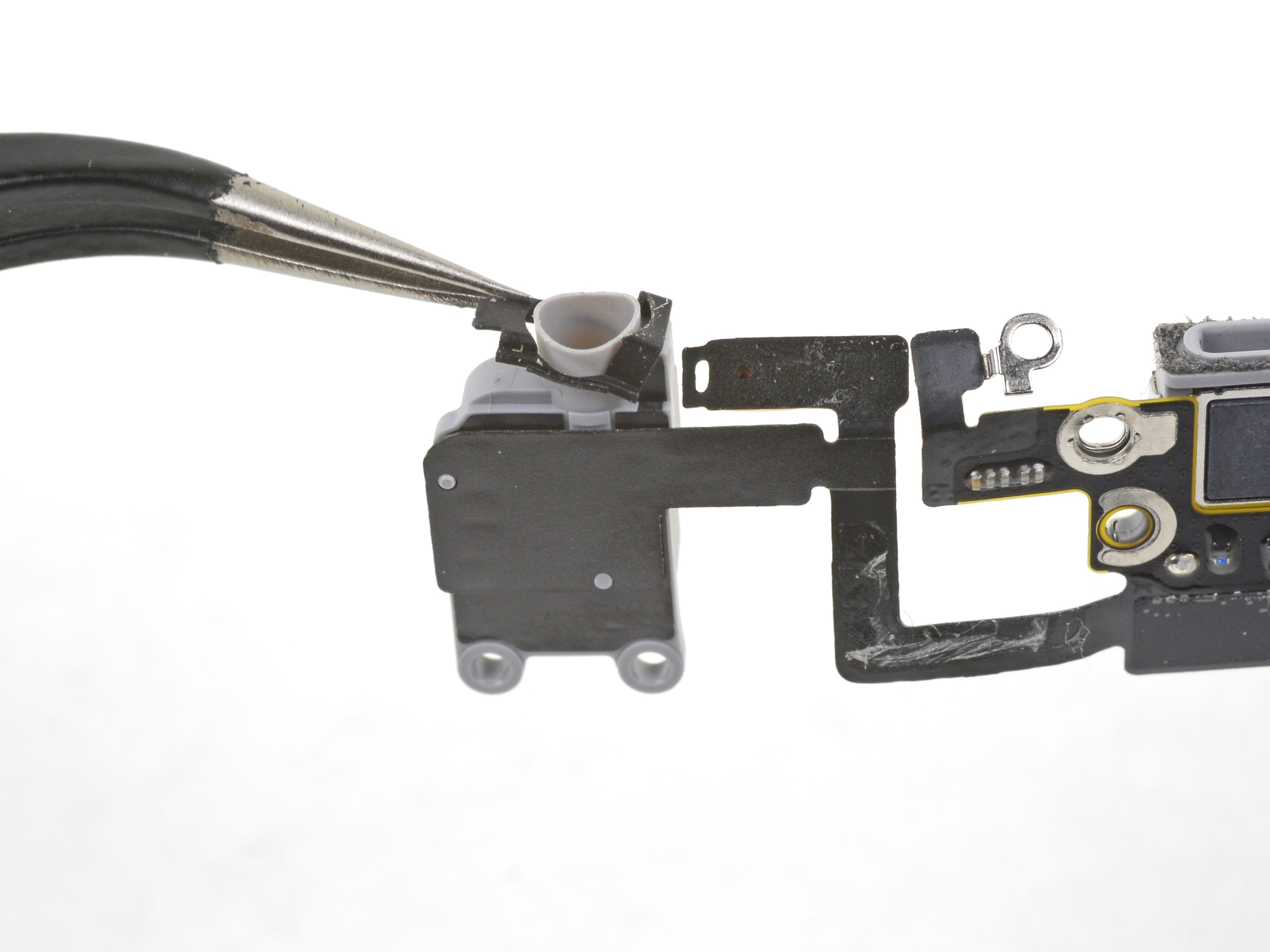 Use the flat end of a spudger to peel the Lightning connector flex cable off the speaker.